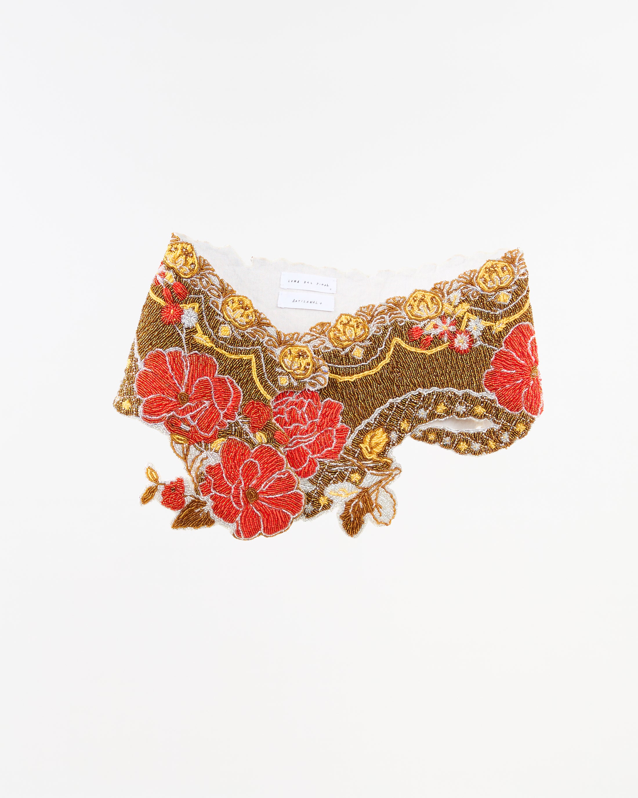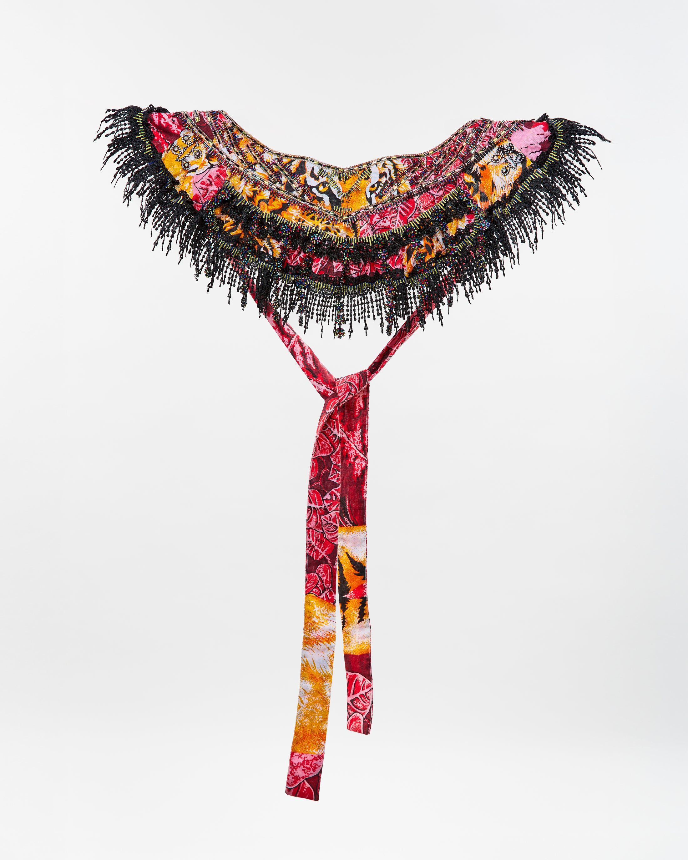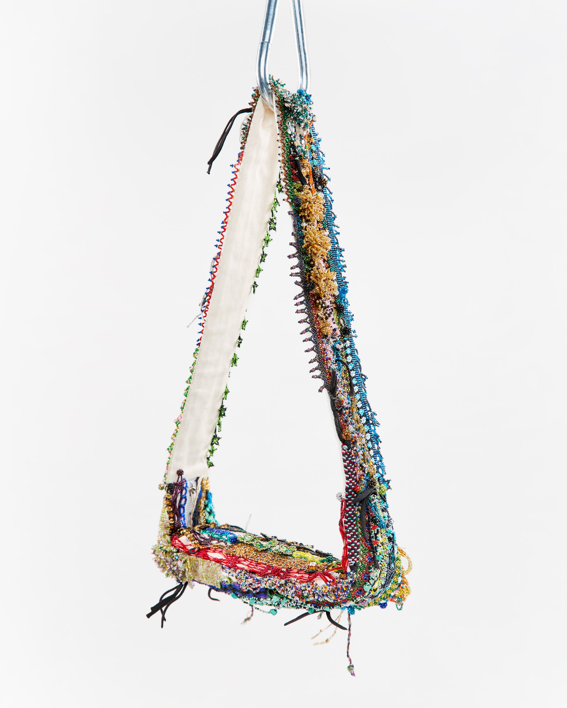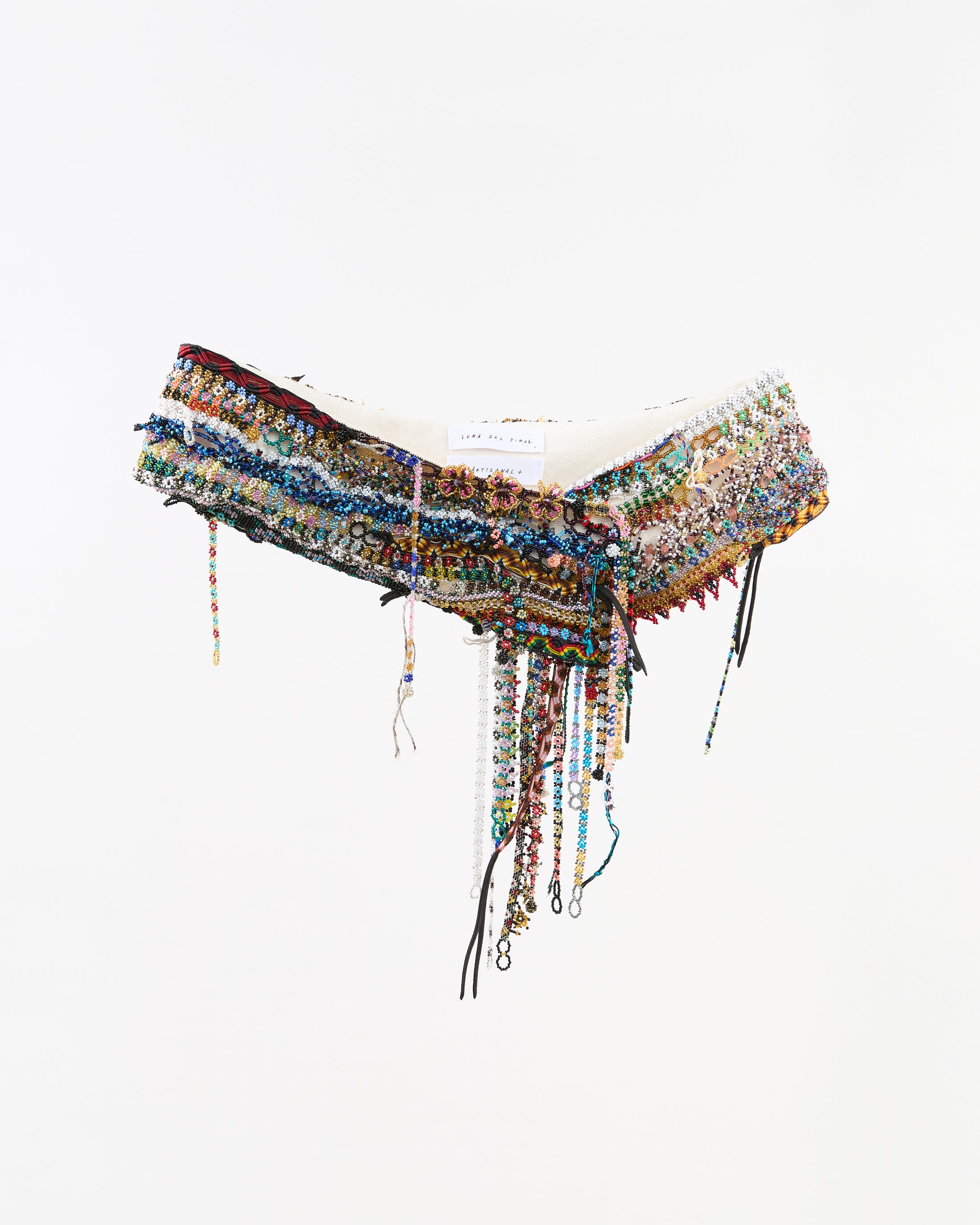Glass beads individually embroidered onto cotton canvas to form a beaded belt skirt, finished by hand.