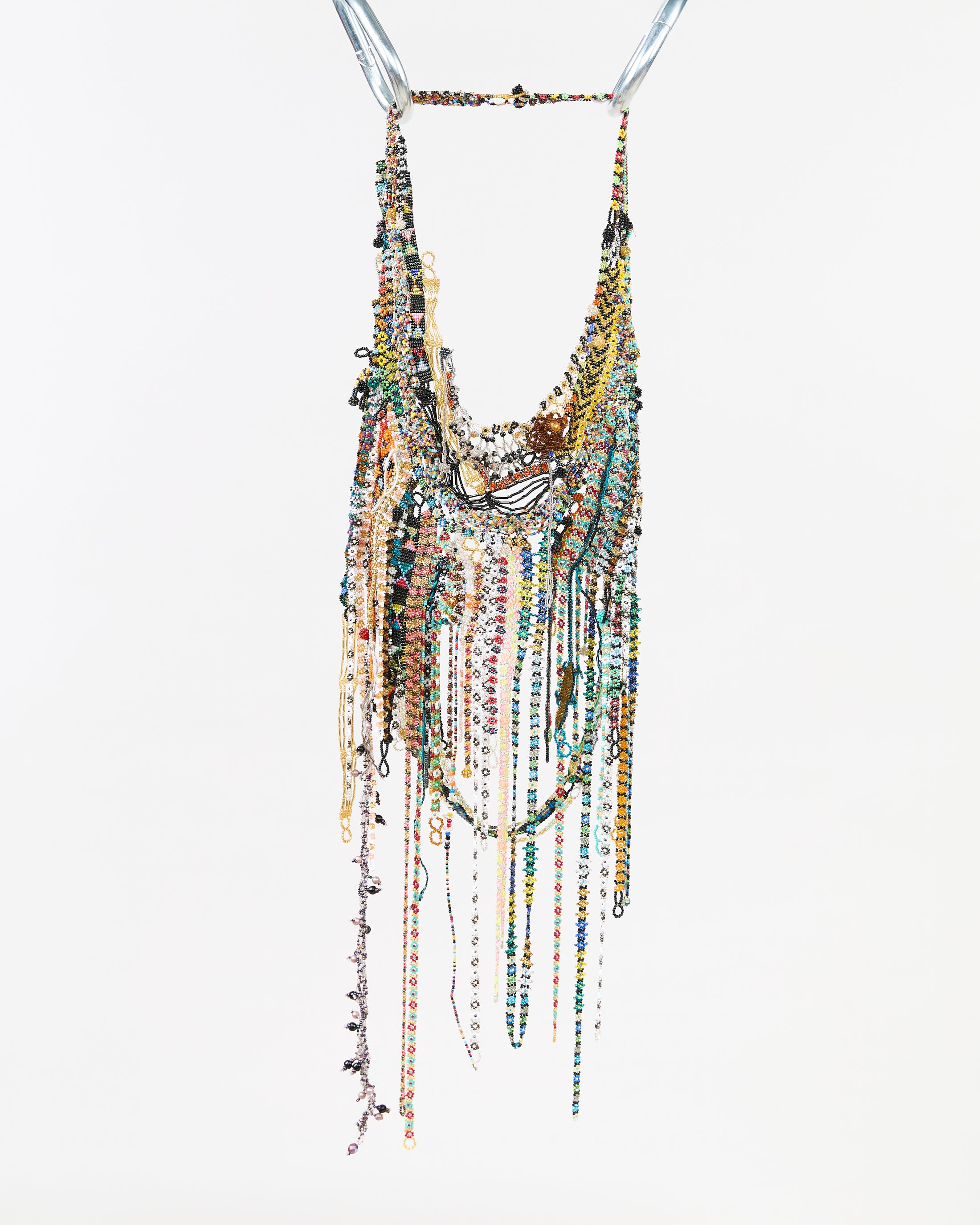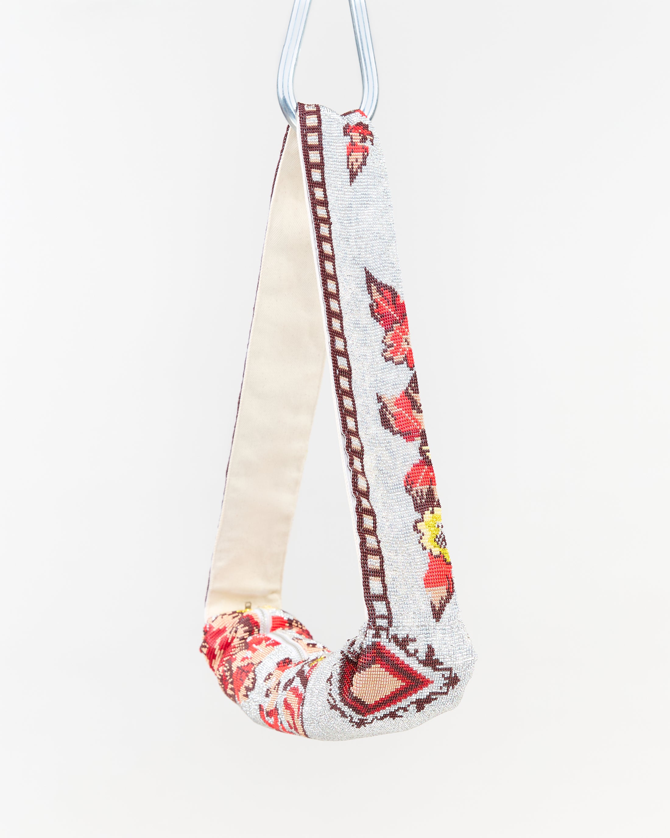 A bag constructed from acrylic, glass-like beads woven simultanously with cotton and assembled by hand.