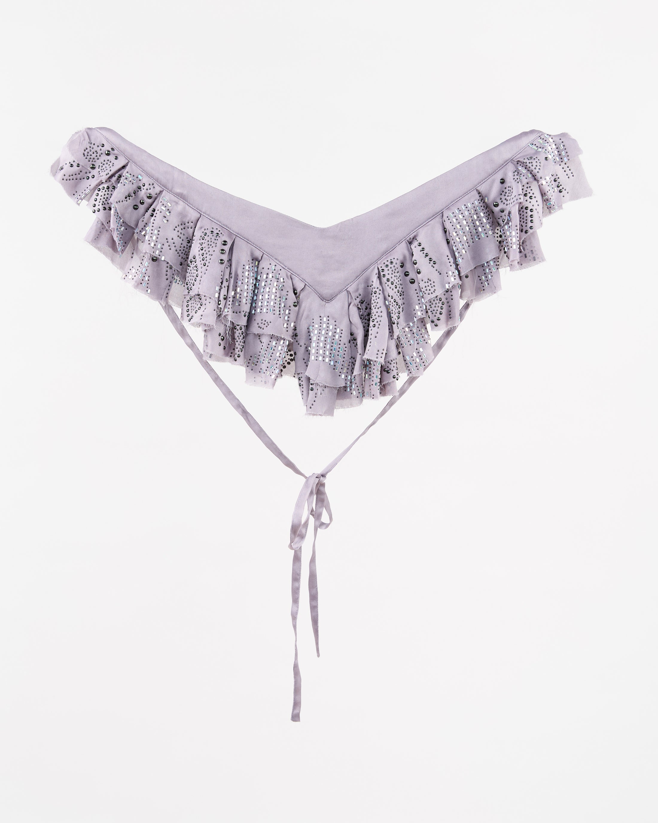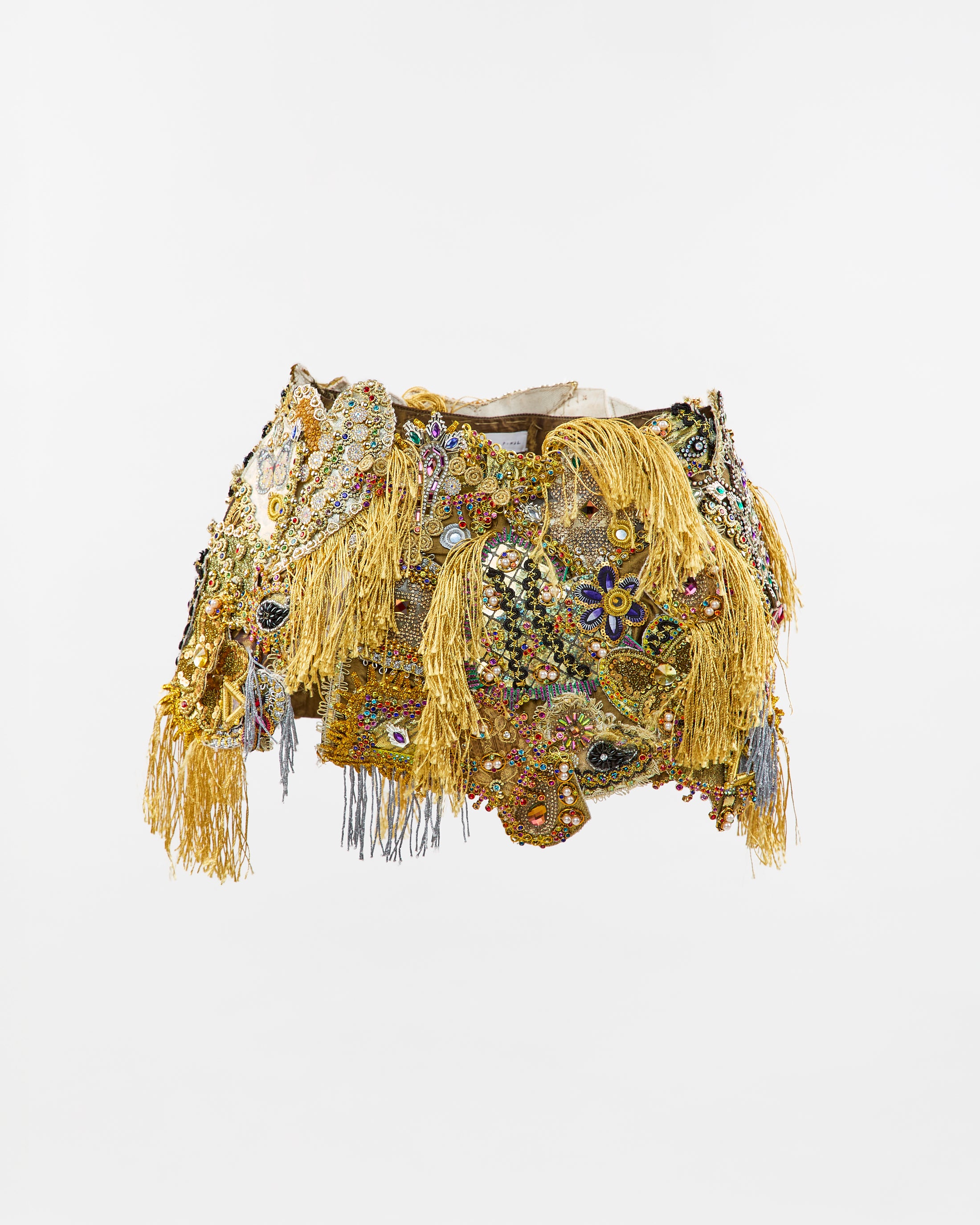 The Ceremonial series includes a top, skirt, and bag, constructed from gold fabric forms in varied shapes. Each piece is embellished by hand with crystals using embroidery, heat-press, and adhesive techniques, then composed onto the garments and bags.