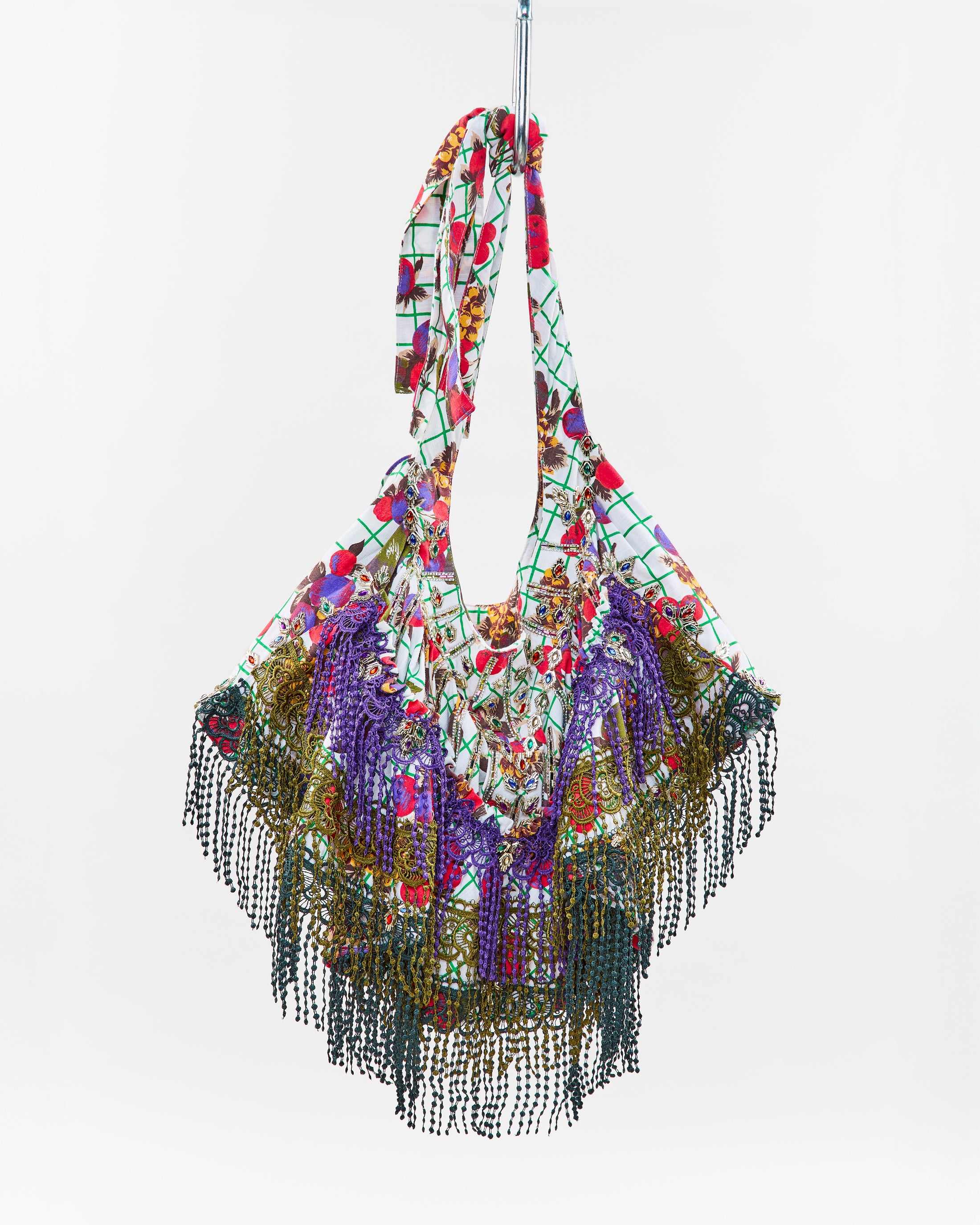 This apron bag is inspired by the workwear of Guatemalan market women, where the apron functions as both utility and personal expression. Our interpretation translates this everyday garment through colour compositions and layered embellishments, applied by hand through embroidery or heat-press techniques. A variation of this piece is also reworked into a bag